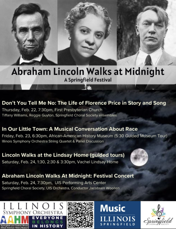 Fourteen years ago, a stack of music was found amongst the papers of the black Chicagoan composer Florence Price: it was her long-lost cantata "Abraham Lincoln Walks at Midnight," set to the poem by Springfield native Vachel Lindsay. And now this lost & found masterpiece will be heard for the first time in Springfield, the city of both Lincoln and Lindsay. The UIS Orchestra will join forces with the Springfield Choral Society and baritone soloist Justin Johnson, under the baton of Jacobsen Woollen. Admission is free. No reservations required.