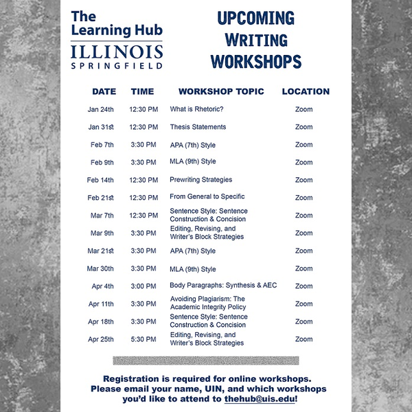 Registration is required for online workshops. Please email your name, UIN, and which workshops you would like to attend to thehub@uis.edu