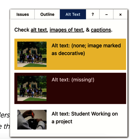 When you select the Alt Text tab, you will be show all the page images and any associated alt text, or an error if the alt text is missing.